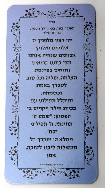 קרטון קשיח ועליו מודפס תפילה לברית מילה לחלוקה לאורחים בשעת הטקס